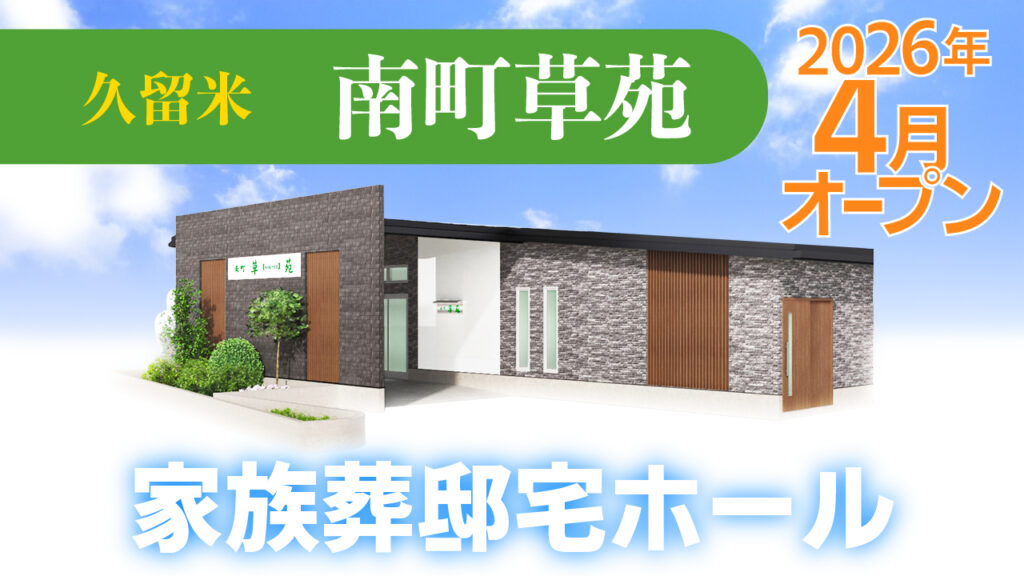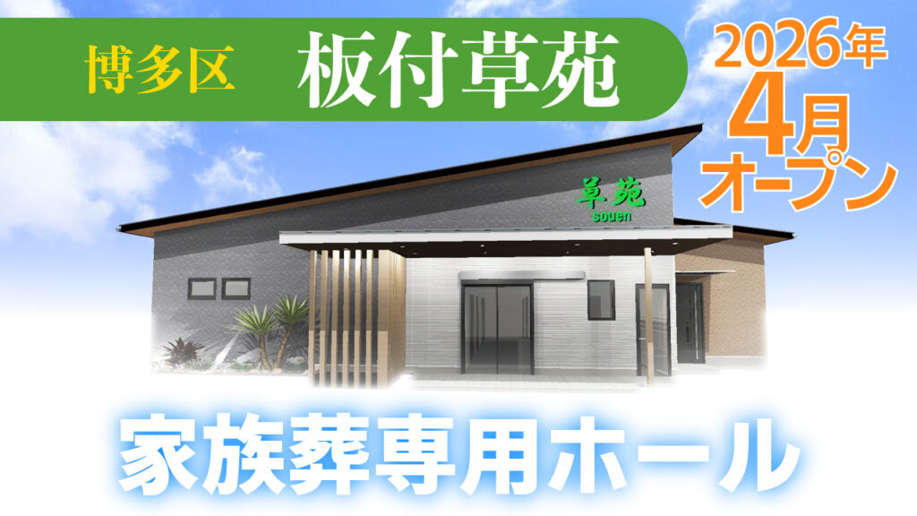 2026.04.06 お知らせ 2026年4月家族葬ホール[博多区 板付草苑][久留米 南町草苑]グランドオープン! 2026年4月、草苑の新しい「家族葬ホール」が2店舗オープンいたします!4月25日(土)・26日(日)には、グランドオープンイベントを開催!ガラポン抽選会など、生花販売など出店もございます。この機会に、新しい家族葬ホールをお気軽にご見学ください。 各イベントの詳細はバナーをクリックしてご確認ください。 この記事をシェアする シェア Tweet